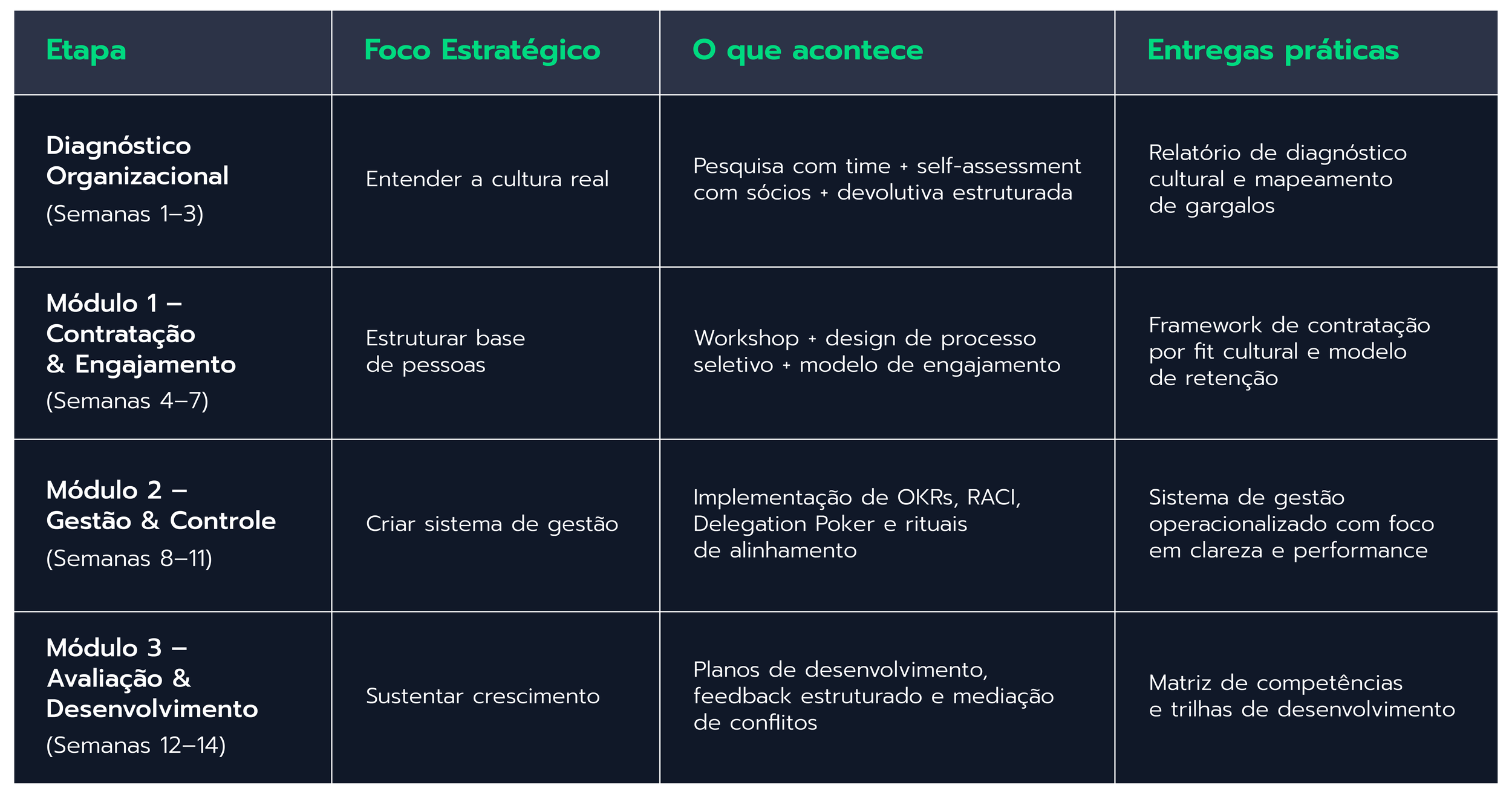 Desenvolver lideranças capazes de sustentar o crescimento da empresa. Apoiar a transição do founder do operacional para o estratégico.